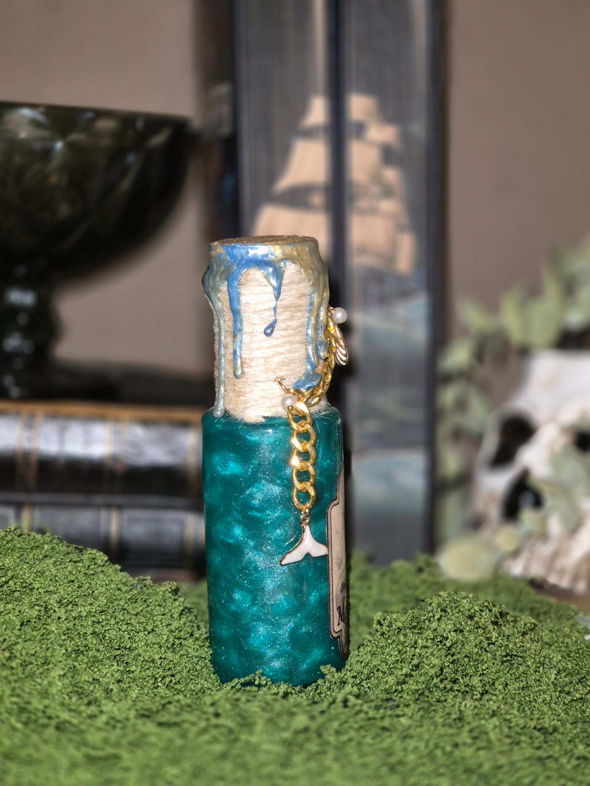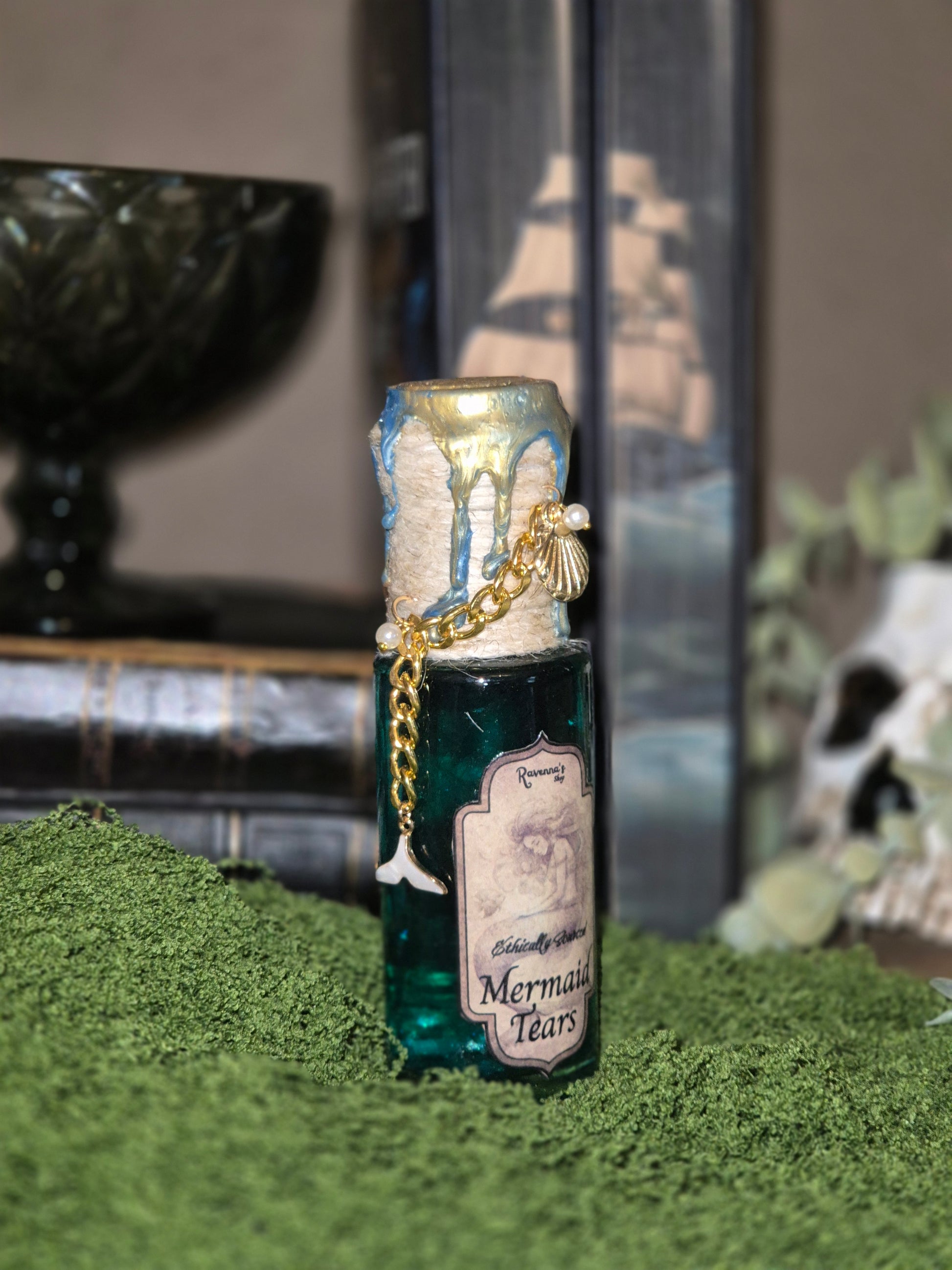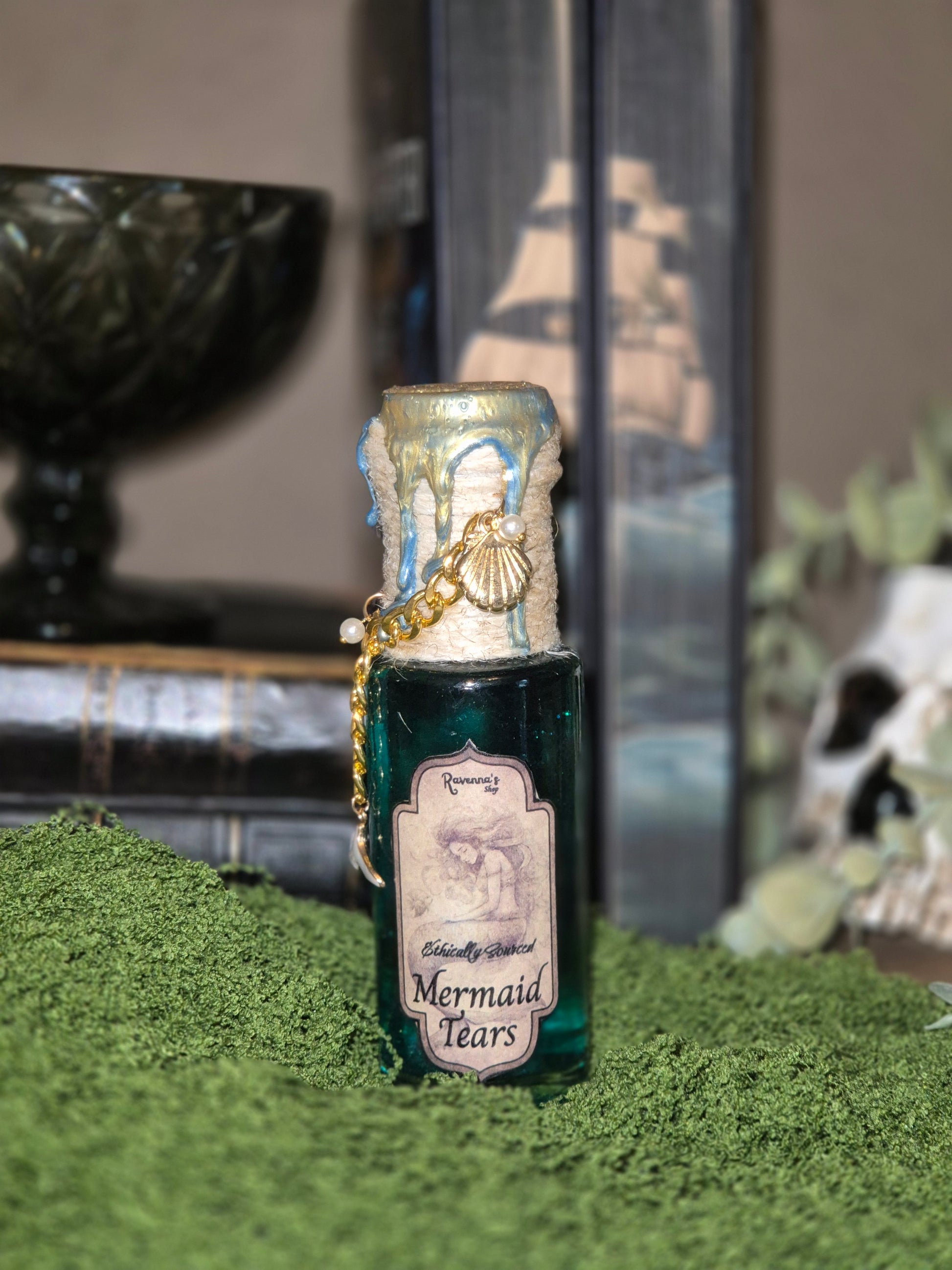 Zorgvuldig verkregen zeemeermin tranen. De fles heeft een heldere zeetint als basis, de tranen die duidelijk zichtbaar zijn en wanneer ermee geschud wordt krijgt de fles een magische tint.