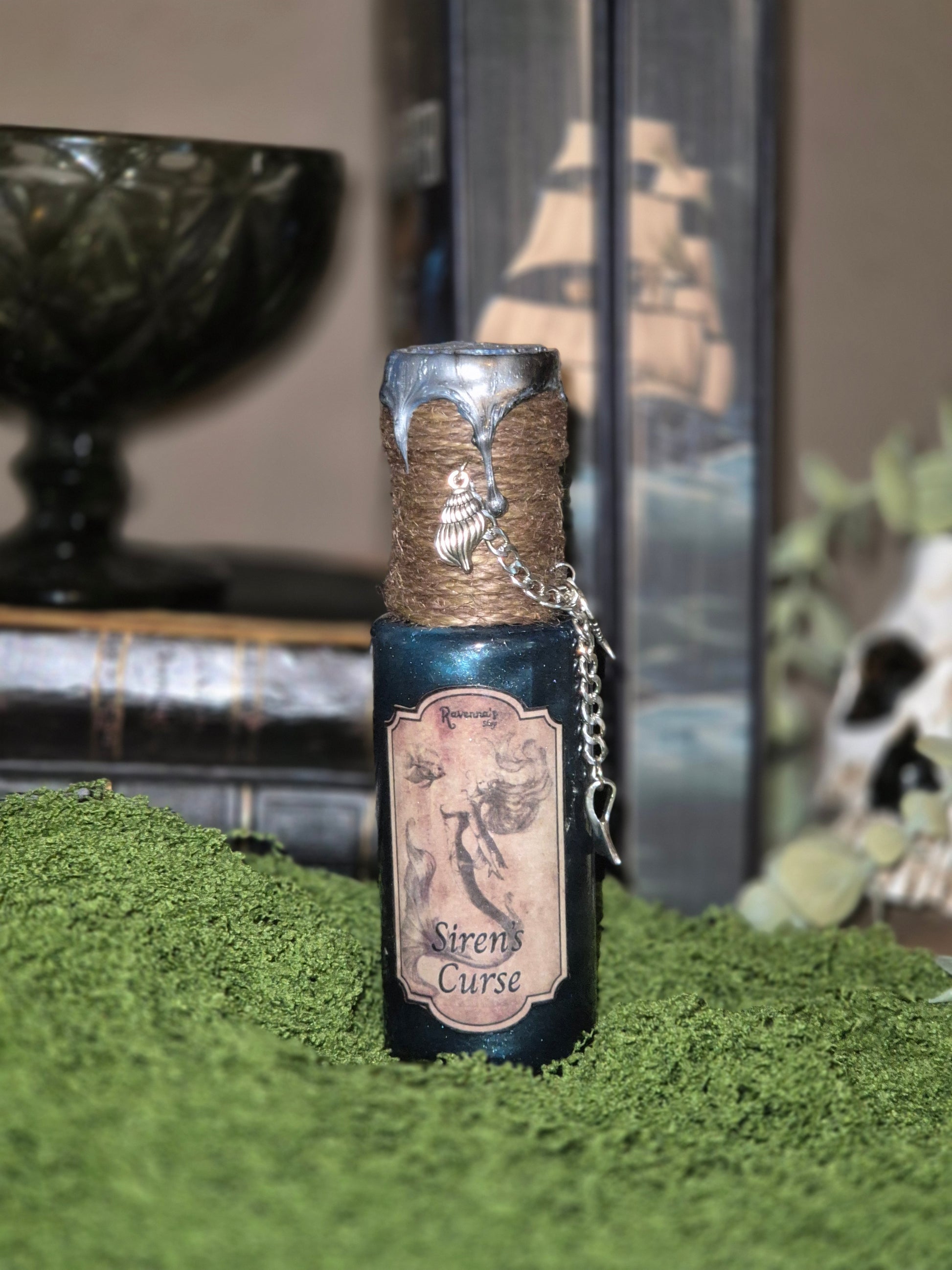 De hals van de fles is gedecoreerd met zilveren kettingen, gestorven vissen, schelpen en de staart van een Siren. De waxseal bevat een prachtige stempel.