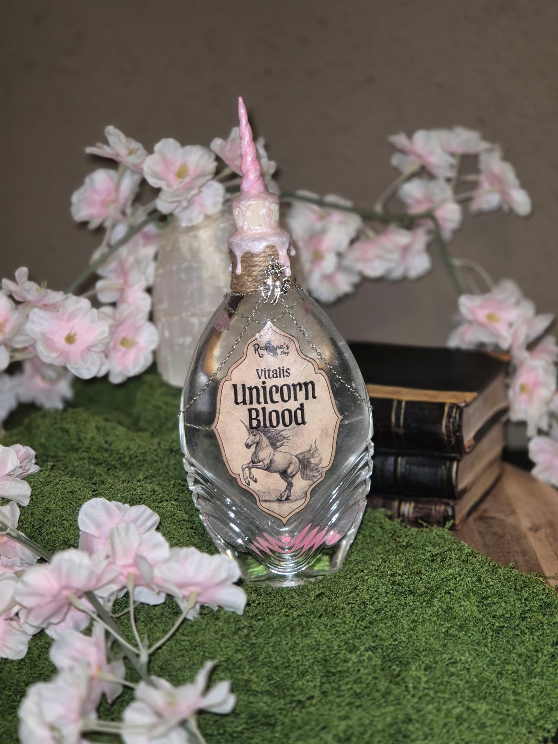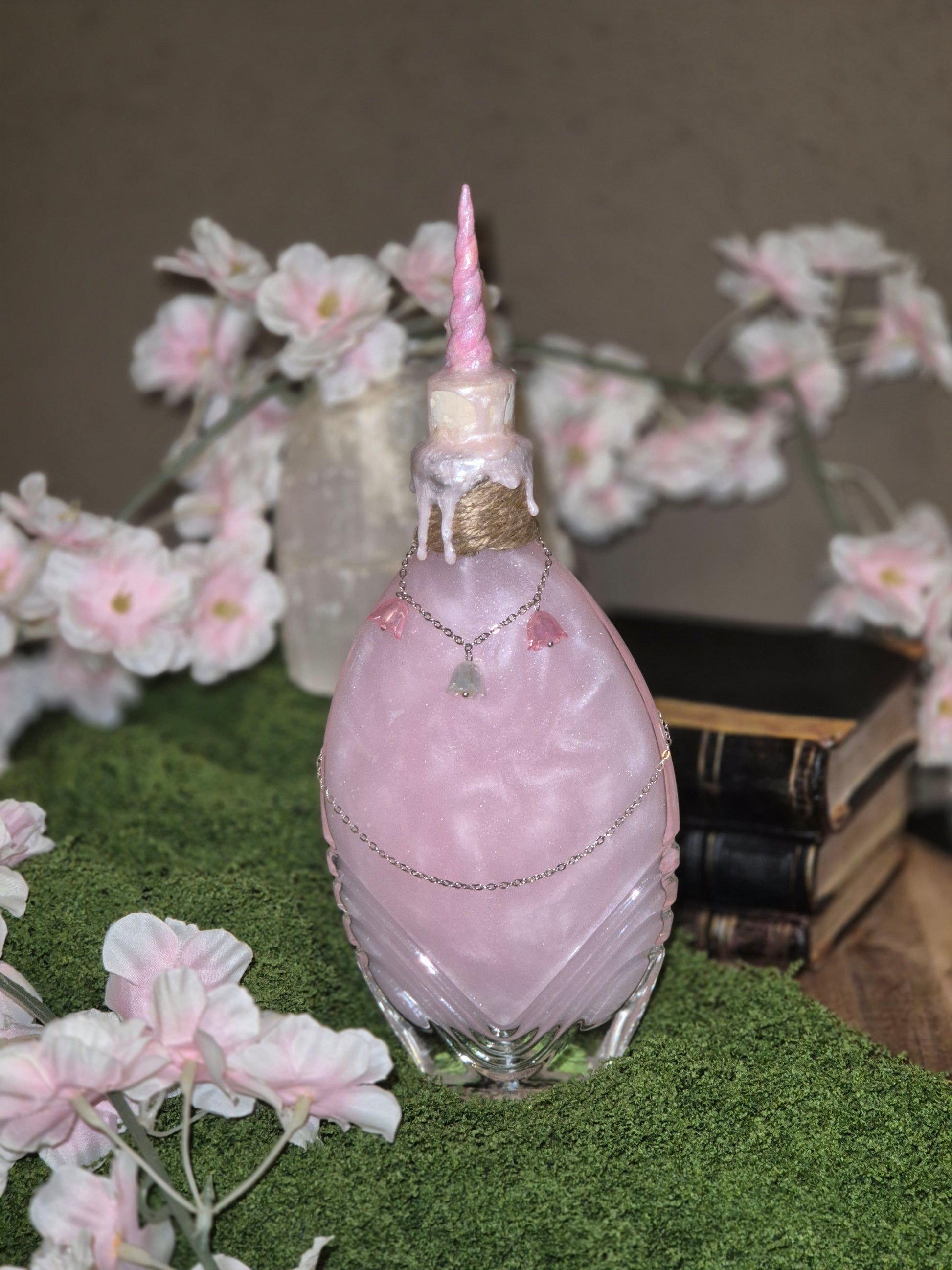 De hals van de fles is gedecoreerd met kettingen, bloemen en een eenhoorn. De kurk is afgesloten met een prachtige hoorn die match met de kleur magie.